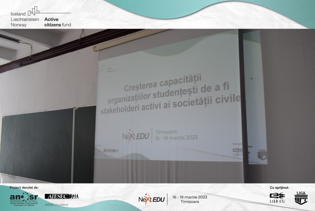 Alianța Națională a Organizațiilor Studențești din România (ANOSR) a organizat, în perioada 16-19 martie 2023, la Timișoara, cu sprijinul Ligii Studenților Facultății de Management în Producție și Transporturi (Liga MPT) și al Ligii Studenților din Facultatea de Electronică și Telecomunicații (LSFETc), o nouă ediție a sesiunii de formare Next EDU, de data aceasta sub egida proiectului „Creșterea capacității organizațiilor studențești de a fi stakeholderi activi ai societății civile”.