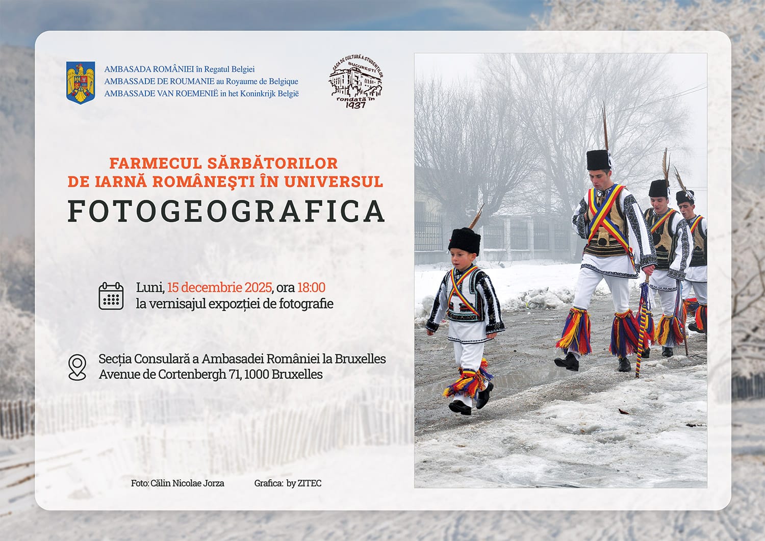 Ambasada României în Regatul Belgiei, în parteneriat cu Casa de Cultură a Studenților București, organizează luni, 15 decembrie 2025, începând cu ora 18:00, la sediul Secției Consulare a Ambasadei României la Bruxelles, din Avenue de Cortenbergh 71, 1000 Bruxelles, vernisajul expoziției de fotografie ”Farmecul sărbătorilor de iarnă româneşti în universul  FOTOGEOGRAFICA” .