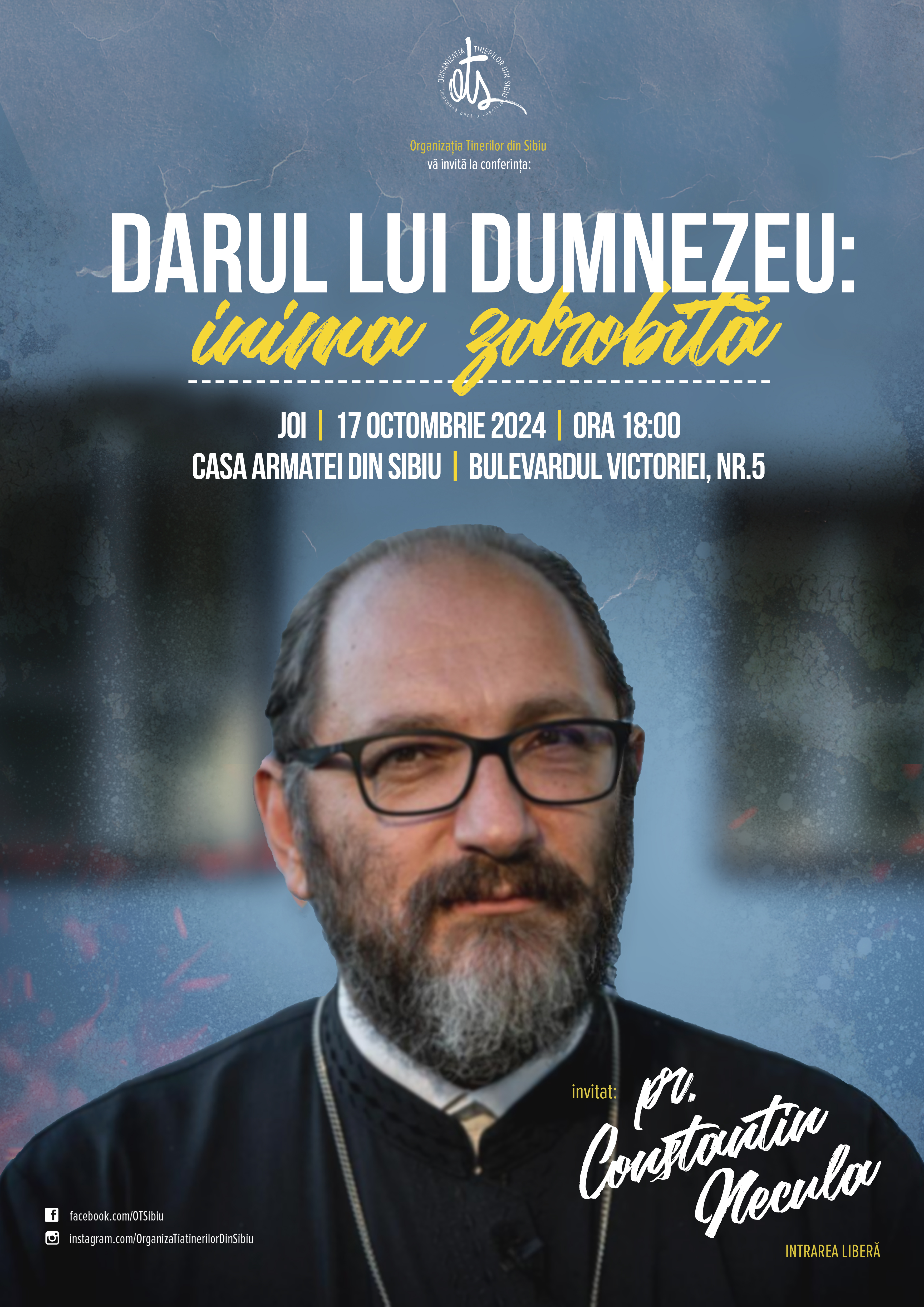 Joi, 17 octombrie 2024, începând cu ora 18:00, la Casa Armatei din Sibiu va avea loc conferința cu tema „Darul lui Dumnezeu: inima zdrobită”, susținută de Pr. Prof. Univ. Dr. Constantin Necula. Părintele Constantin Necula este unul dintre cei mai cunoscuți și îndrăgiți preoți ortodocși ai acestor vremuri. Prin intermediul predicilor sale, al cărților, al conferințelor pe care le susține și prin participarea la diverse emisiuni și rubrici difuzate la televiziune, la radio și în online, Părintele a ajuns la sufletele oamenilor de toate vârstele, ortodocși – dar nu numai – din țară și din străinătate.