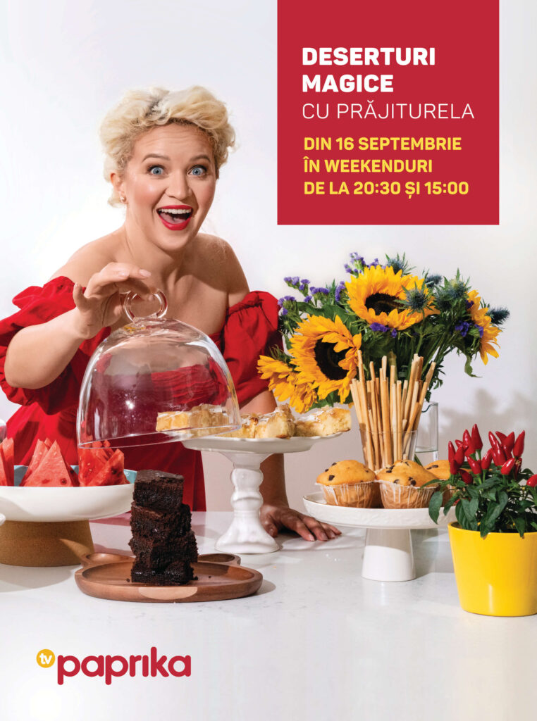 Urmărește, în fiecare weekend, la TV Paprika, noua emisiune culinară, producție locală, de la ora 20:30, ”Deserturi magice cu Prăjiturela”.