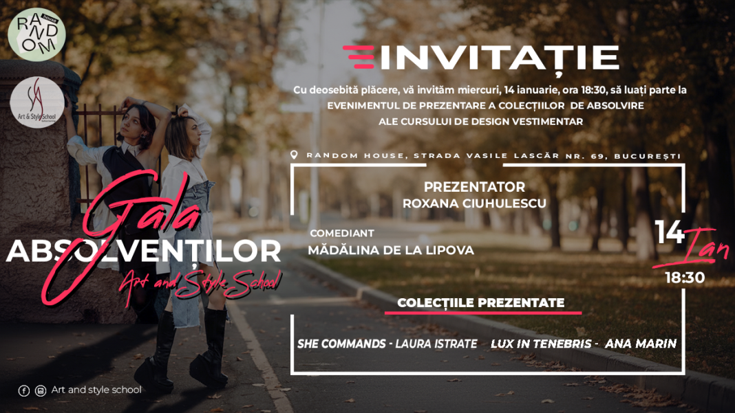 Art&Style School organizează miercuri, 14 ianuarie 2026, de la ora 18:30, Gala Absolvenților – un eveniment dedicat lansării oficiale a noii generații de designeri vestimentari. Evenimentul va avea loc la Radom House, pe strada Vasile Lascăr nr. 69 din București, și va aduce în prim-plan creațiile originale ale cursanților care au finalizat recent programul școlii.
