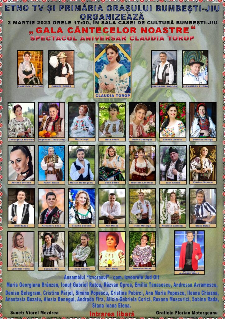 În data de 02 martie, începând cu ora 17:00, la Casa de Cultură a orașului Bumbești-Jiu din Gorj va avea loc „Gala Cântecelor Noastre”, un spectacol aniversar Claudia Torop organizat de Etno Tv și Primăria Orașului Bumbești Jiu, prezentat de Georgel Nucă.