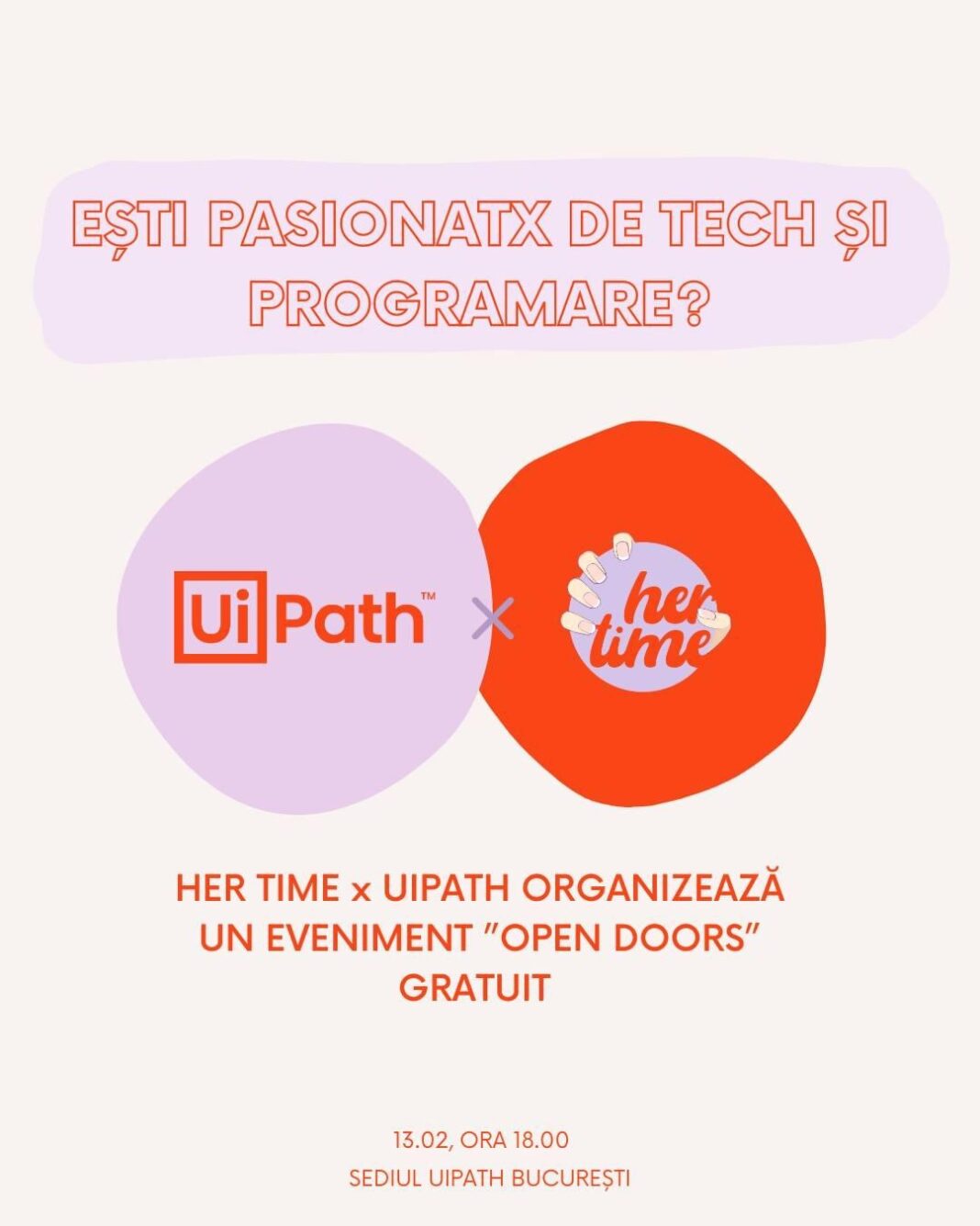 Studenții și tinerii interesați de sectorul tech au ocazia să participe luni, 13 februarie, de la ora 18:00, la evenimentul “open doors,” organizat de Her Time Romania, în parteneriat cu UiPath. Acesta va avea loc în București, la sediul companiei de pe strada Vasile Alecsandri 4 și Constantin Daniel 11, Clădire A, etajele 5 și 6, 010613.