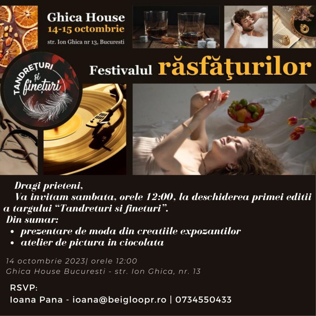 “Tandrețuri și finețuri” se va desfășura între 14 și 15 octombrie, la Casa Ghica din centrul vechi al Bucureștiului, între orele 10:00 și 20:00 (sâmbătă) și 10:00-18:00 (duminică).