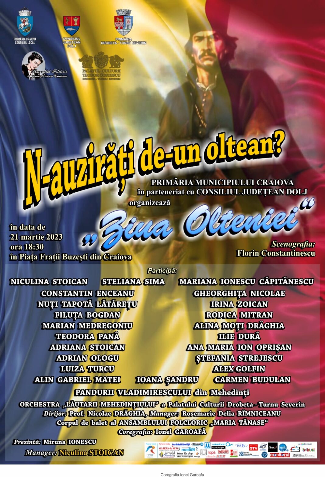 Printre multe alte evenimente de comemorare, începând cu ora 18:30, în Piața Frații Buzești din Craiova va avea loc spectacolul „N-auzirăți de-un oltean?”.