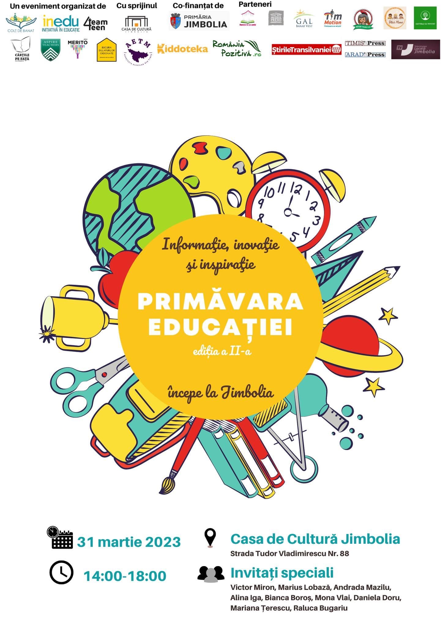 „Primăvara Educației” va începe la Jimbolia! Acest eveniment – dedicat educatorilor, învățătorilor și profesorilor – este, la fel ca prima ediție, unul gratuit și se va desfășura la Casa de Cultură a Orașului Jimbolia pe data de 31 martie 2023, începând cu ora 14:00. Scopul este ca procesul educațional să fie precum o primăvară perpetuă, marcat de speranță, dorință și voință de a șlefui cu cât mai multă îndemânare caracterele educabililor. De aceea, evenimentul oferă o bună oportunitate pentru dascăli de a găsi informație, inovație și inspirație.