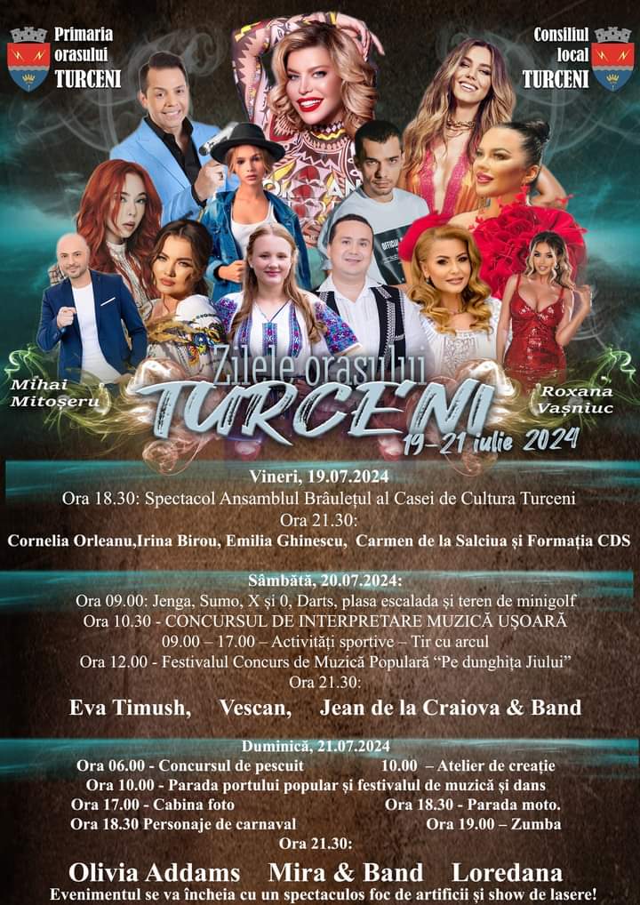 Emilia Ghinescu, Carmen de la Sălciua, Vescan, Jean de la Craiova, Mira, Cornelia Orleanu, Irina Birou, Eva Timush, Olivia Addams și Loredana sunt cativa dintre artiștii ce o să urce pe scenă la Zilele Turceniului 2024.