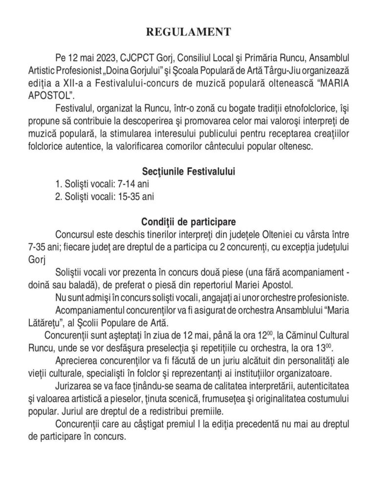 Vineri, 12 mai 2023, la Runcu se va desfășura Festivalul-Concurs al Cântecului Popular Oltenesc „Maria Apostol”, ediția a XII-a. Se pot înscrie tinerii interpreți din Oltenia cu vârsta între 7 și 35 de ani, câte 2 din fiecare județ, cu excepția Gorjului – din Gorj se pot înscrie mai mulți.…