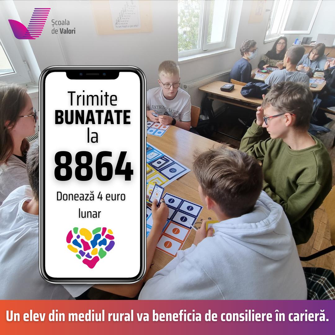 În 2025, ne propunem ca prin „Școala Bunătății” să susținem 180 de elevi din 6 școli din mediul rural, oferindu-le 6 ateliere de consiliere în carieră și activități educaționale care le vor permite să își descopere talentele, să înțeleagă competențele necesare pe piața muncii și să își construiască un plan de carieră durabil. Dar pentru aceasta este nevoie de susținerea celor care cred în puterea educației centrate pe valori. De aceea, am lansat campania de donare prin SMS, prin trimiterea cuvântului „BUNATATE” la 8864, vei dona 4 euro, pentru ca elevii de gimnaziu să beneficieze de consiliere în carieră.