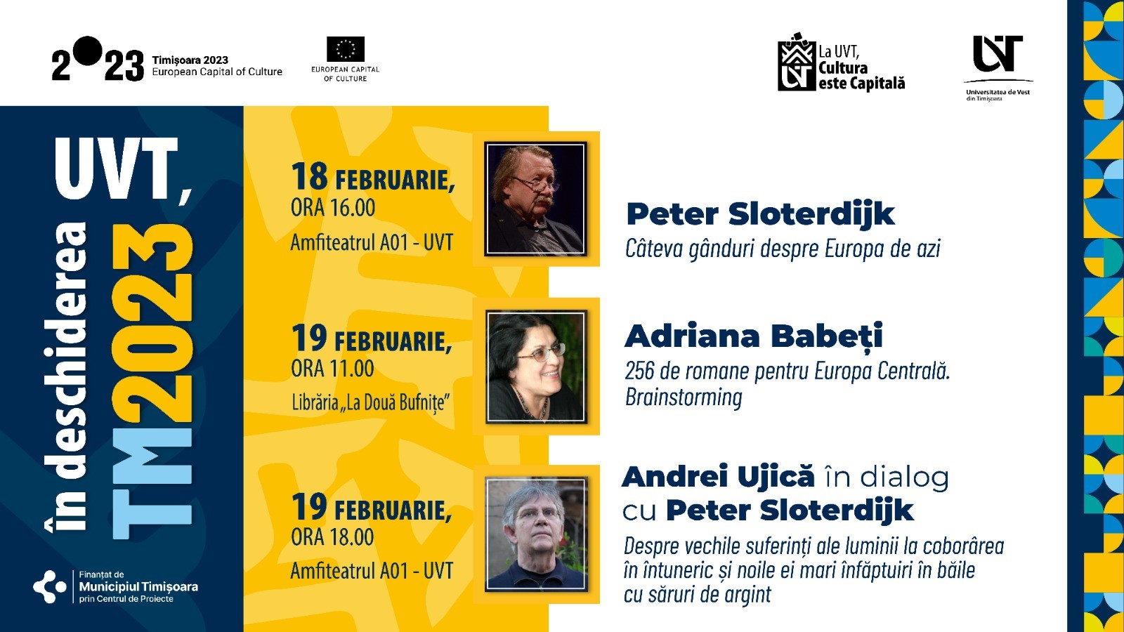 Tot duminică, în 19 februarie 2023, la UVT va avea loc un eveniment de tip dezbatere publică, în cadrul căruia se vor afla alături de publicul timișorean două personalități semnificative pentru dezbaterea intelectuală contemporană, filosoful Peter Sloterdijk, alături de scriitorul și regizorul Andrei Ujică. Această conferință va avea loc la Universitatea de Vest din Timișoara, începând cu ora 18 (în amfiteatrul A01 din sediul principal UVT, V.Pârvan 4), iar genericul sub care se va desfășura realizează o trimitere provocatoare – „Despre vechile suferinți ale lumii la coborârea în întuneric și noile ei mari înfăptuiri în băile cu săruri de argint”.
